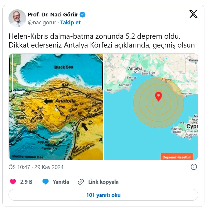 Antalya açıklarında meydana gelen depremin ardından açıklamalarda bulunan Prof. Dr. Naci Görür, "Helen-Kıbrıs dalma-batma zonunda 5,2 deprem oldu. Dikkat ederseniz Antalya Körfezi açıklarında, geçmiş olsun" ifadelerini kullandı.