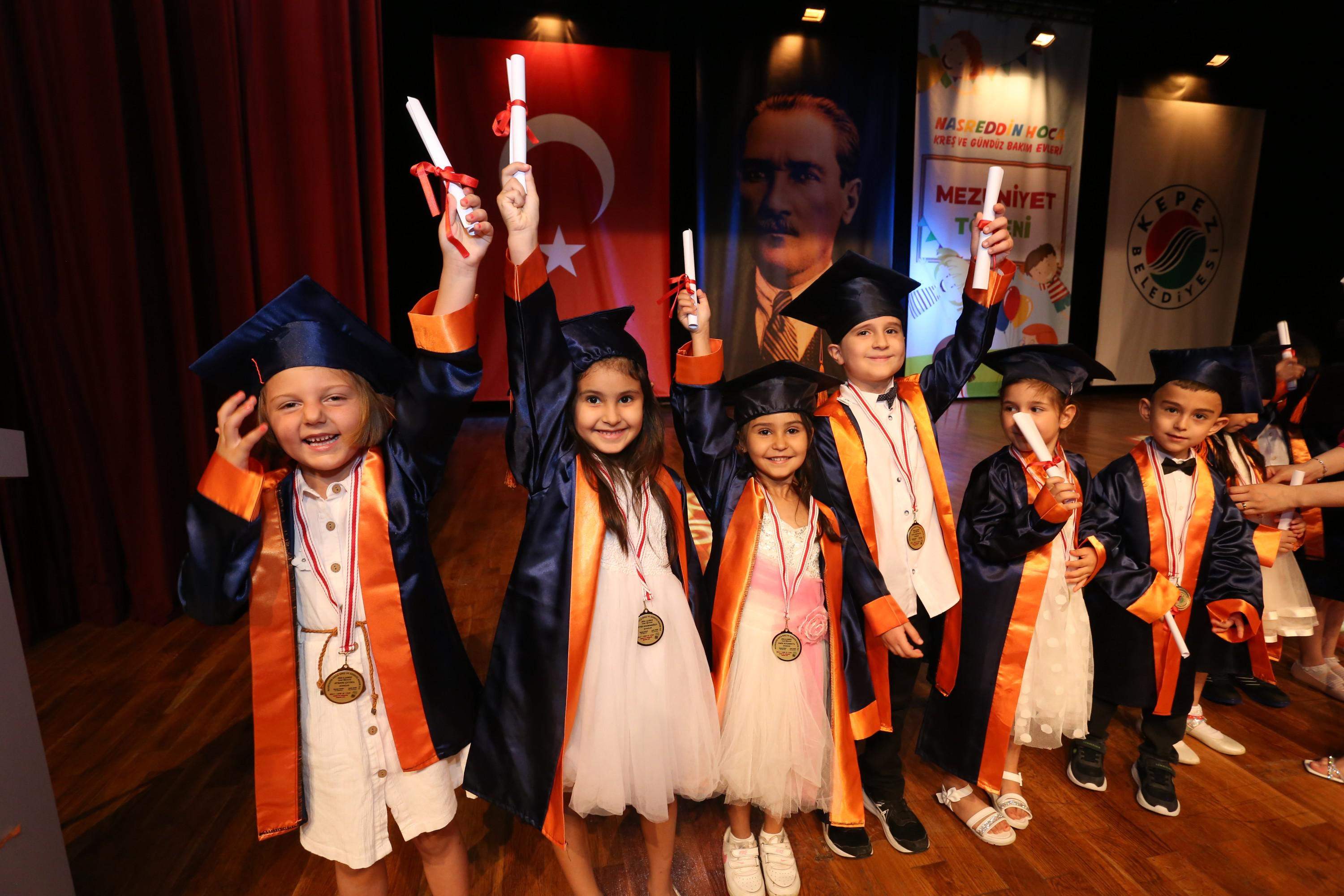 Antalya’nın en çok talep gören Nasreddin Hoca Kreş ve Gündüz Bakım Evleri, 2021-2022 yılı eğitim ve öğretim dönemini tamamlayan öğrenciler için mezuniyet töreni düzenledi. Erdem Bayazıt Kültür Merkezi’nde düzenlenen törene Kepez Belediye Başkanı Hakan Tütüncü’de katılarak, öğrenci ve velilerin mutluluklarına ortak oldu. Yoğunluk nedeniyle iki ayrı günde düzenlenen mezuniyet töreninde; Erenköy, Özgürlük, Teomanpaşa, Ahatlı, Sakarya şubelerinin öğrencileri mezuniyet belgelerini aldı. Mezuniyet töreninde öğrenciler büyük bir sevinç yaşarken, veliler de duygu dolu anlar yaşadılar.