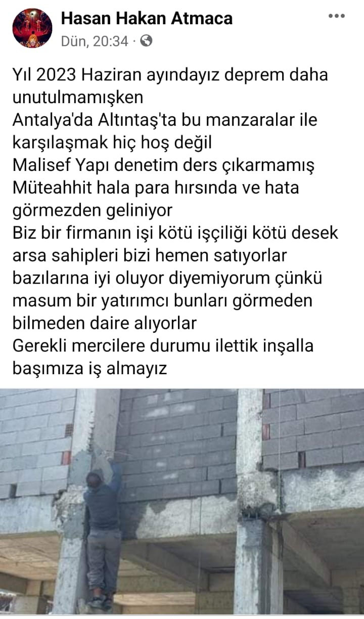 Atmaca’nın yeni imara açılan ve hızla büyüyen Aksu Altıntaş’ta yeni yapılan bir inşaatta çektiğini söylediği fotoğraf görenleri dehşete düşürdü. Daha Kahramanmaraş dahil 11 ili etkileyen depremin izleri silinmemişken, Atmaca’nın paylaştığı görüntüler, binlerce kişinin öldüğü afetten ders almadığımızı gösterdi.