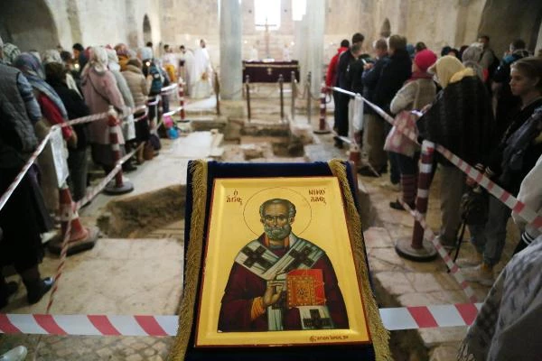 Dünyada ‘Noel Baba’ olarak tanınan Aziz Nikolaos, ölümünün 1679’uncu yıl dönümünde Antalya’nın Demre ilçesinde mezarının bulunduğu ve yüzyıllar boyunca kilise olarak kullanılan Aziz Nikolaos Anıt Müzesi’ndeki ayinle anıldı. Ayine, Aziz Nikolaos’a ait olduğu belirtilen kemik parçası da özel kutuda getirildi.