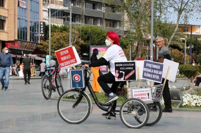 Antalya'da yaşayan 67 yaşındaki emekli ebe Hayriye Kılıç, 15 yıl mücadele ederek oğlunu bağımlı olmaktan kurtardı. Bu uğurda herşeyini kaybeden Kılıç, şimdi başka annelerin canı yanmasın diye üzerinde uyuşturucu bağımlılığına dikkat çeken dövizler bulunan bisikleti ile hergün binlerce pedal çeviriyor.