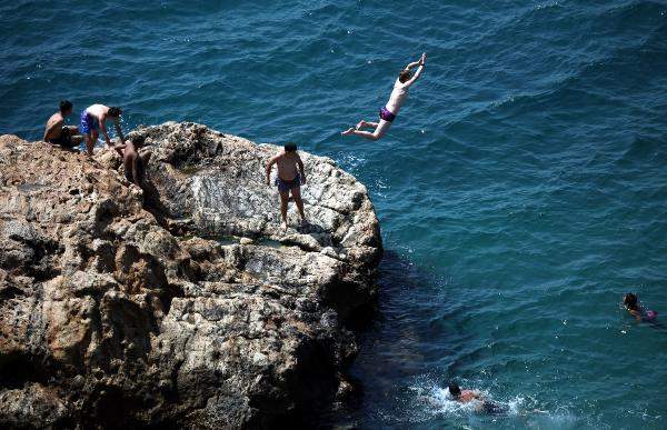 Antalya'da, okulların kapanması ile gençler de sahilleri doldurdu. Falezler bölgesinde kayalıklardan denize atlayanlar, arkadaşlarıyla eğlenip vakit geçirdi.
