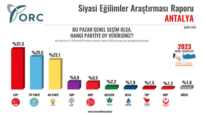 ORC Araştırma’nın 21-28 Ocak arasında 2320 kişi ile yaptığı Antalya’daki ‘Siyasi Eğilimler Araştırması’na göre, Ak Parti ile MHP’den oluşan Cumhur İttifakı toplam yüzde 28,6 oranında oy alırken, CHP, İyi Parti, Saadet, Deva, Gelecek ve DP’nin oluşturduğu Millet İttifakı’nın aldığı oy oranı yüzde 61.7’ye ulaşıyor.