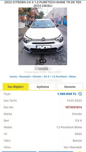 1001 km olarak ilana konulan sıfır otomobiller arasında birkaç hafta önce Türkiye’de satışa sunulan araçlar bile var. Bir ilan sitesinde, 9 Ocak tarihinde lansman fiyatı 899 bin 500 TL olarak duyurulan Citroen C4 X modelinin 1.2 PureTech Shine versiyonu 1 milyon 160 bin TL fiyatla yer bulmuş durumda. Diğer yandan, liste fiyatı 1 milyon 329 bin 900 TL olan Skoda 1.5 TSI Prestige’in 1 milyon 535 bin TL’den, liste fiyatı 465 bin TL olan Hyundai i20 1.4 MPI Style’ın 640 bin TL’den, liste fiyatı 659 bin 700 TL olan Volkswagen Golf 1.0 TSI PS Manuel Impression’ın ise 835 bin TL’den ikinci el ilan sitelerinde 1001 kilometre bilgisi ile satışa çıkarıldığı görülüyor. Birçok sıfır araç ise daha bayiden yüklenirken, çekici üzerinde fotoğraflanarak ilana konulmuş.