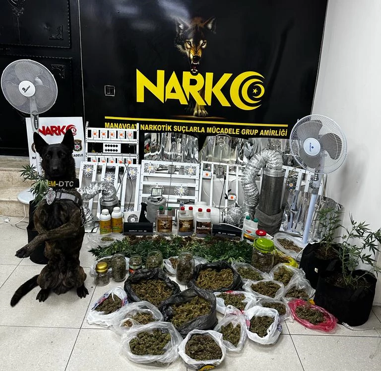 Cumhuriyet Başsavcılığı koordinesinde Manavgat İlçe Emniyet Müdürlüğü Narkotik Suçlarla Mücadele Grup Amirliğince yapılan çalışmalar kapsamında M.G. isimli şahsın Aşağı Pazarcı mahallesinde bulunan evine, Narkotik Madde Arama Köpeği Pars ile birlikte yapılan arama sonucunda 2 ayrı odada 70 kök hint keneviri, 28 paket esrar maddesi ve esrar maddesi yetiştirmeye yarayan envanterlerin ele geçirildiği belirtildi.