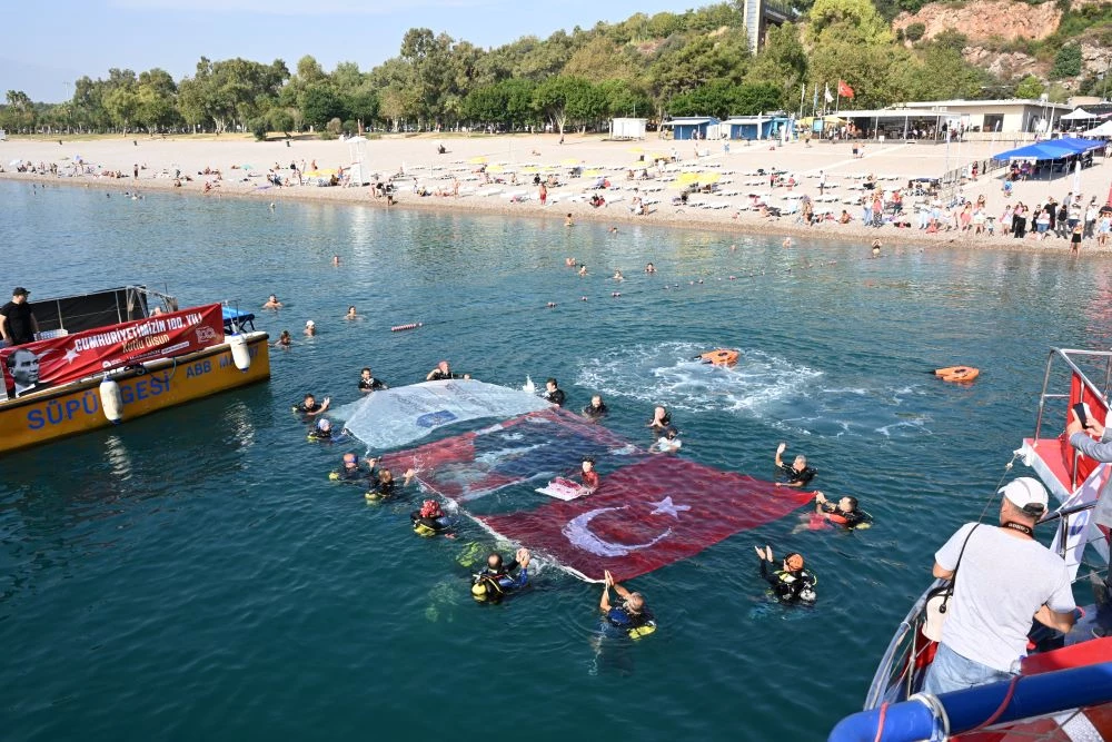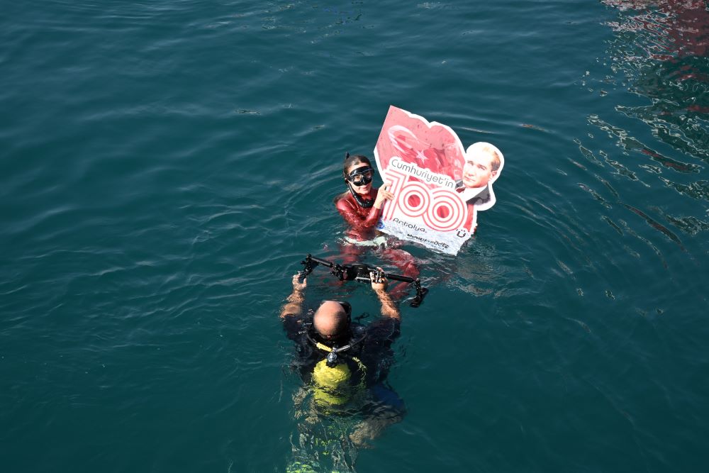 Türkiye Cumhuriyeti'nin 100'üncü yılı tüm yurtta coşkuyla kutlanıyor. Turizm kenti Antalya'nın dünyaca ünlü Konyaaltı Sahili'nde Büyükşehir Belediyesi tarafından bir dizi etkinlik düzenlendi. Kadın ve erkek yüzücüler, 100'üncü yıl anısına açık deniz yüzme yarışı yaptı. Milli Sporcu ve Serbest Dalış Rekortmeni Şahika Ercümen de Konyaaltı Sahili'nden tekneyle açılıp, serbest dalış gerçekleştirdi. Dipten, üzerinde 'Türkiye Cumhuriyeti 100 yaşında' yazılı pankartla su yüzeyine çıkan Ercümen'i hem sahildeki kalabalık hem de tekneden kendisini izleyenler uzun süre alkışladı. Ercümen, daha sonra su yüzeyine serilen Türk bayrağı ve Atatürk posteriyle birlikte hatıra fotoğrafı çektirdi. Tekneyle yeniden karaya çıkan Şahika Ercümen, özellikle kadınların yoğun ilgisiyle karşılaştı. Fotoğraf çektirmek isteyen kadınlar uzun süre birbirleriyle yarıştı.