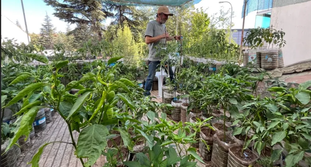 Eskişehir’de yaşayan Salim Pektaş, iş yerinin 18 metrekarelik terasına içi toprak dolu 200 bidona diktiği sebzelerle küçük bir bahçe dizayn ederken, gününün 8 saatini bu bahçede geçiriyor.