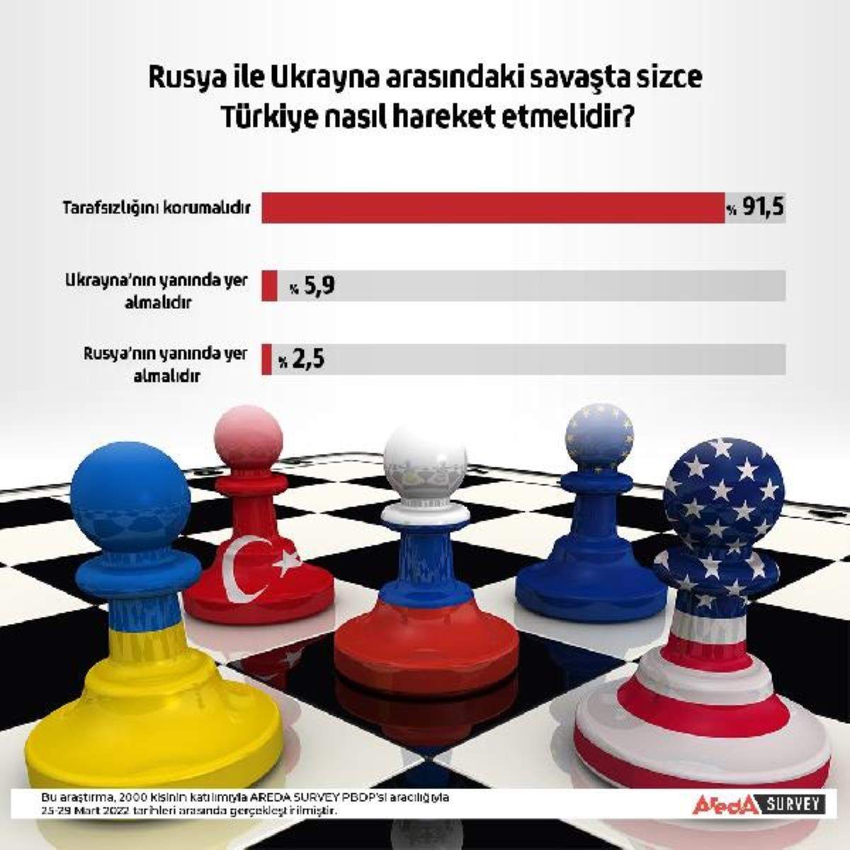 Areda Survey'in, ' Rusya ile Ukrayna arasındaki savaşta, Türkiye'nin nasıl hareket etmesi gerektiği' konusu üzerine yaptığı anketin sonuçlarına göre Türk halkının yüzde 91,5'inin Türkiye'nin iki ülke arasındaki tarafsız politikasını desteklediğini ortaya koydu.