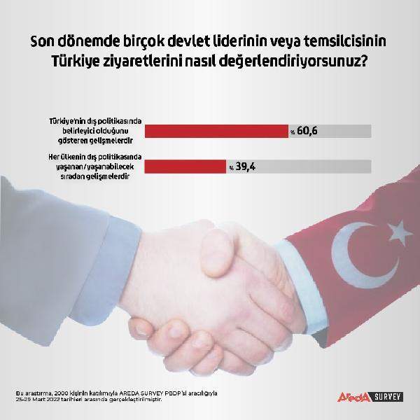 Rusya-Ukrayna savaşı başladığı günden itibaren Türkiye'nin çok sayıda devlet başkanının veya üst düzey yetkilinin uğrak yeri haline gelmesi konusuna ilişkin, katılımcılara yöneltilen 'Son dönemde birçok devlet liderinin veya temsilcisinin Türkiye ziyaretlerini nasıl değerlendiriyorsunuz?' sorusuna, yüzde 60,6'lık bir oranla 'Türkiye'nin dış politikasında belirleyici güç olduğunu gösteren gelişmelerdir' yanıtı geldi. Bu durumu, her ülkenin dış politikasında yaşanan normal gelişme olarak görenlerin oranı yüzde 39,4 düzeyinde seyretti.