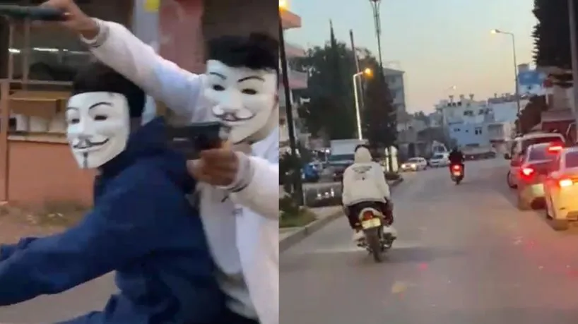 Serik ilçesi Merkez Mahallesi Salı Pazarı civarında akşam saatlerinde motosiklet üzerinde, yüzlerinde maske bulunan iki gençten arkada oturan, seyir halindeyken iki elindeki iki tabancayla, yol güzergahındaki sürücü ve vatandaşlara korku dolu anlar yaşattı. Diğer motosiklet üzerindeki arkadaşları cep telefonuyla o anları kaydederken, maskeli gencin ellerindeki silahı vatandaşlara doğrultması korku dolu anlara neden oldu.