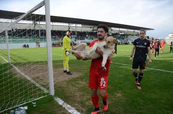 TFF 2'nci Lig Beyaz Grup'ta Serik Belediyespor, Diyarbekirspor A.Ş. maçının 30'uncu dakikasındaki korner atışı sırasında sahaya giren köpeği futbolcular, kucaklayıp dışarı çıkardı.