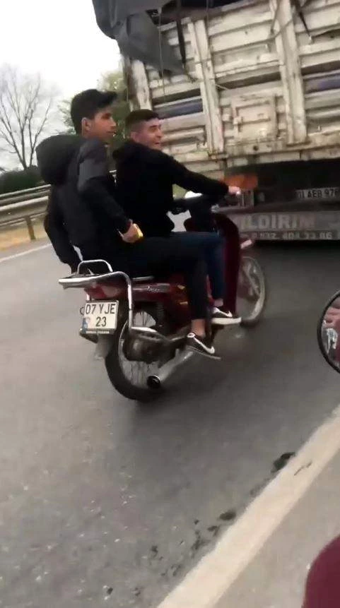 Serik ilçesi D-400 karayolunda motosikletli iki genç, seyir halindeyken önünde ilerleyen kamyonun arkasına yaklaşarak hem kendi canlarını hiçe saydı hem de trafiği tehlikeye attı. Yaptıkları bu tehlikeli davranışı cep telefonu ile kaydeden sürücünün davranışı ise yürekleri ağza getirdi. Pes dedirten görüntüler sosyal medyada yayınlanınca polis ekipleri harekete geçti. Plaka üzerinden motosiklet sürücüsüne 588 TL cezai işlem uygulandığı öğrenildi. /HABERLER.COM
