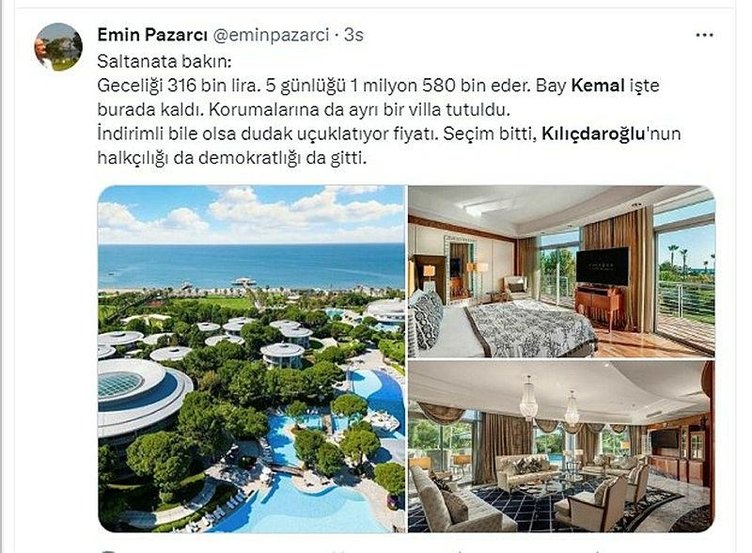 Sosyal medya hesabından bir paylaşım yapan Gazeteci Emin Pazarcı da Kılıçdaroğlu'na tepki gösterdi. Pazarcı, 'Saltanata bakın: Geceliği 316 bin lira. 5 günlüğü 1 milyon 580 bin eder. Bay Kemal işte burada kaldı. Korumalarına da ayrı bir villa tutuldu. İndirimli bile olsa dudak uçuklatıyor fiyatı. Seçim bitti, Kılıçdaroğlu'nun halkçılığı da demokratlığı da gitti.' ifadelerini kullandı. /SABAH.COM.TR