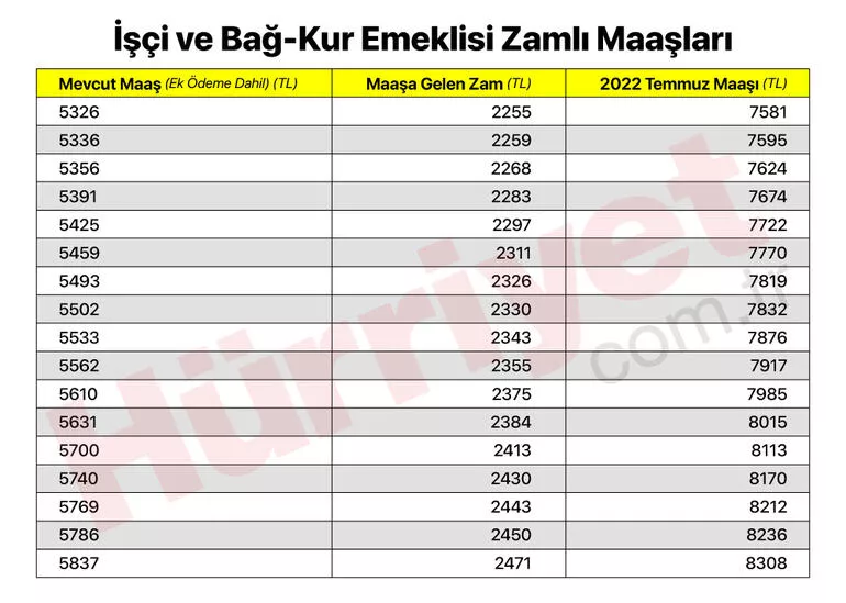 Türkiye’de milyonlarca kişiyi ilgilendiren Emekli maaşı zam oranı Haziran ayı enflasyonunu açıklanmasıyla belli oldu. Haziran’da enflasyon yıllık yüzde 78.62 aylık olarak da yüzde 4,95 gerçekleşti. 6 aylık değişim ise yüzde 42,35 oldu. Böylece SGK ve Bağ-Kur emeklileri yüzde 42,35 oranında zam almayı hak etti. /HÜRRİYET.COM.TR