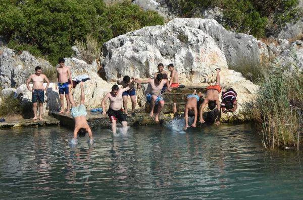 Soğuk suya giren Havva Can da 'Demre’mizin şifalı suyu. Herkes serinlemek için hastalığa şifa niyetine geliyor buraya. Cilt lekelerine, her şeye iyi geliyor. 1 dakika girseniz, 4-5 saat soğuk geliyor. Herkesi buraya bekleriz' ifadelerini kullandı. /GEZİNOMİ