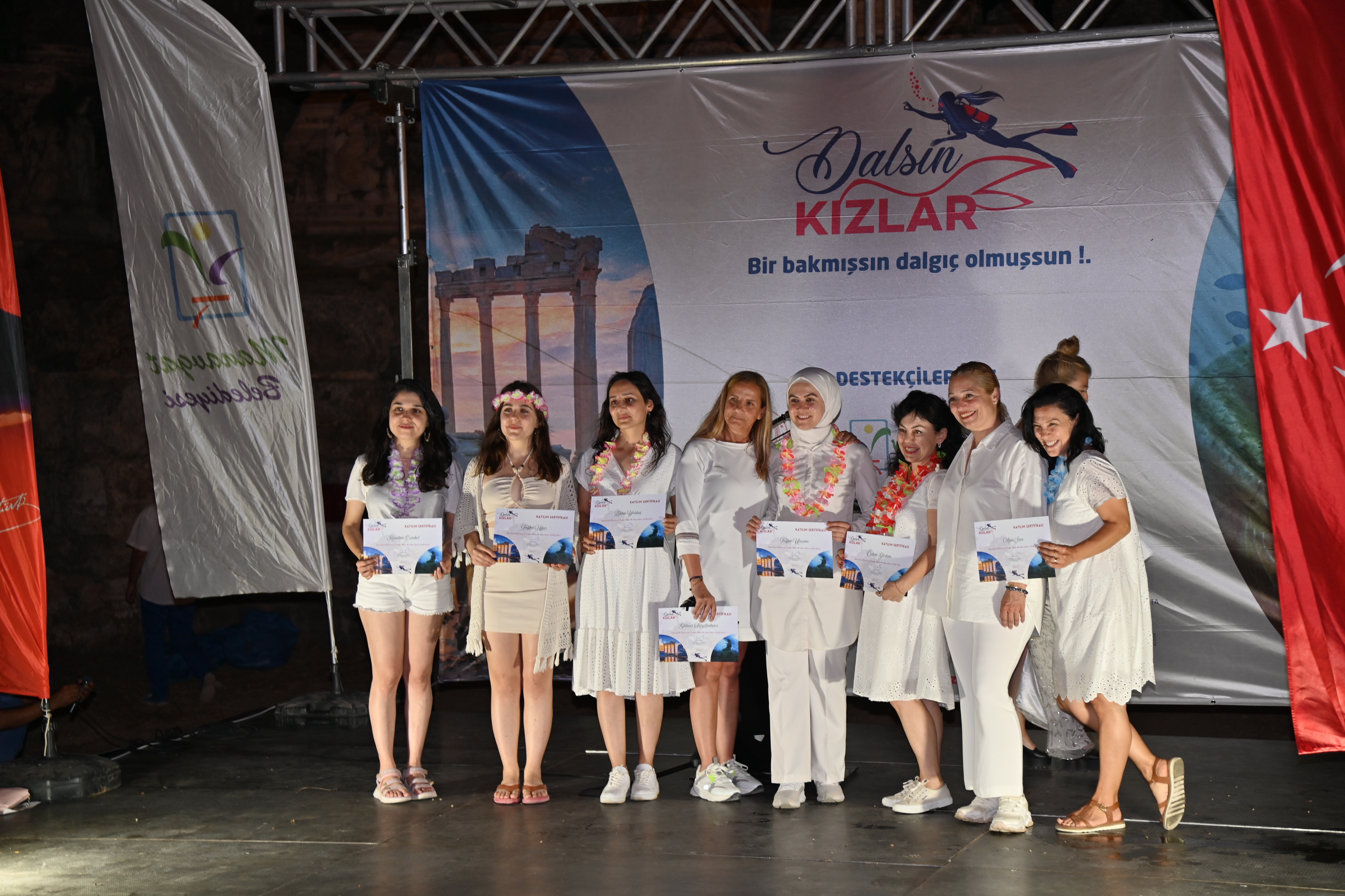 Dalışların ardından Antik Side’yi keşfetme imkanı bulan Dalsın Kızlar ekibi, bol bol hatıra fotoğrafı çektirdi. Katılımcılar sertifika ve plaketlerini tarihi Side Antik Tiyatro’da aldılar. Manavgat Belediye Başkanı Niyazi Nefi Kara’ya da desteklerinden dolayı Gaye Dülger tarafından plaket takdiminde bulunuldu. Dülger, katkılarından dolayı Başkan Kara’ya teşekkür etti.