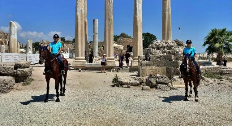 Manavgat İlçe Jandarma Komutanlığı ve Jandarma Atlı Birlik Komutanlığı iş birliğiyle Side’de sahil ve plajların kontrolünü atlı jandarma sağlıyor. Selimiye Jandarma Karakol Komutanlığı sorumluluk bölgesinde 12.00-15.00 saatleri arasında sahil, plaj ve Apollon Tapınağı mevkilerinde atlı birlikler önleyici kolluk devriyesi faaliyeti gerçekleştiriyor. /İHA