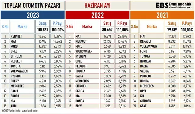 Haziran ayında hem toplam satışlarda hem de otomobil satışlarında Renault atağa kalkarak uzun bir süre sonra Fiat'ı geçip, zirveye oturdu. Ama ilk 6 ay sonunda hem toplam satışlarda hem otomobil satışlarında Fiat’ın açık ara liderliği devam ediyor. Haziran’da Opel, Peugeot ve Citroen markalarındaki çıkış ise devam etti. Opel 3.sırada yer aldı.
