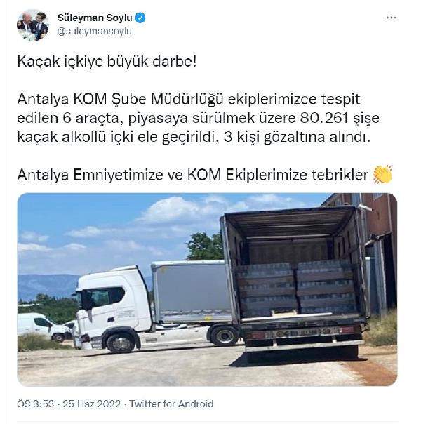 Bakan Soylu, Twitter'daki hesabından yaptığı açıklamada, 'Kaçak içkiye büyük darbe! Antalya KOM Şube Müdürlüğü ekiplerimizce tespit edilen 6 araçta, piyasaya sürülmek üzere 80 bin 261 şişe kaçak alkollü içki ele geçirildi, 3 kişi gözaltına alındı. Antalya emniyetimize ve KOM ekiplerimize tebrikler' dedi. /HABERLER.COM