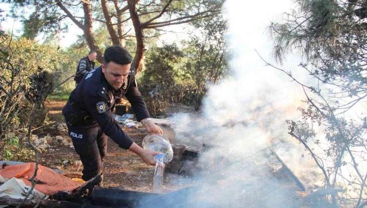 Antalya’nın Konyaaltı ilçesinde ormanlık alanda yanan baraka, ekipleri harekete geçirdi. Polis ve bir vatandaş, alevlerin ormana sıçramaması için su dolu bidonlarla yangına müdahalede bulundu.