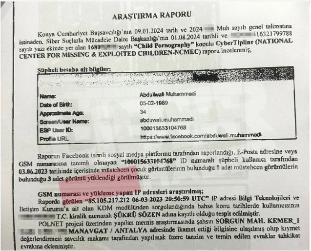 Ulusal Kayıp ve İstismara Uğrayan Çocuklar Merkezi (NCMEC) tarafından hazırlanan ve Türkiye’ye resmi kanallardan iletilen rapor, 3 Haziran 2023 tarihinde bir sosyal medya hesabı üzerinden “çocuk istismarı içerikli görüntülerin” yüklenmiş olabileceğini bildirdi. Raporun Konya Cumhuriyet Başsavcılığına ulaşmasının ardından Siber Suçlarla Mücadele Şube Müdürlüğü tarafından teknik inceleme başlatıldı. Savcılığın 9 Ocak 2024 tarihli talimat yazısında, söz konusu ihbarın işleme alınması ve “gerçek faile ulaşılabilmesi için kapsamlı teknik araştırma yapılması” talimatı verildi.