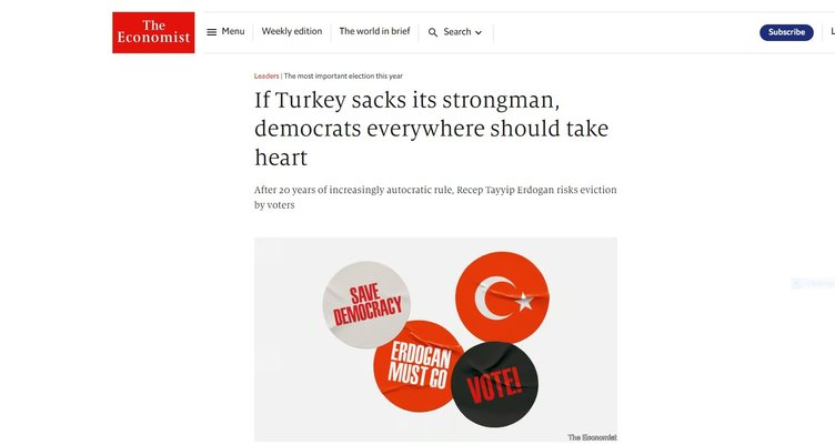 Daha önce de 14 Mayıs temennisini açık açaık yazan The Economist dergisi yeni bir skandal ile okuyucularının karşısına çıktı. Sözde tarafsız Batı basınının kirli yüzünü bir kez daha gösteren The Economist, Mayıs ayı kapağında '2023'ün en önemli seçimleri' başlığı ile okurlarının karşısına çıkarken 'Erdoğan gitmeli' ifadelerini kullandı.