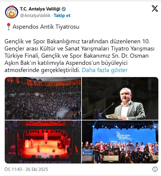 Gençlik ve Spor Bakanlığı tarafından düzenlenen 10. Gençler Arası Kültür ve Sanat Yarışmaları Tiyatro Yarışması Türkiye Finali, Bakan Dr. Osman Aşkın Bak’ın katılımıyla Aspendos Antik Tiyatrosu’nda gerçekleştirildi.