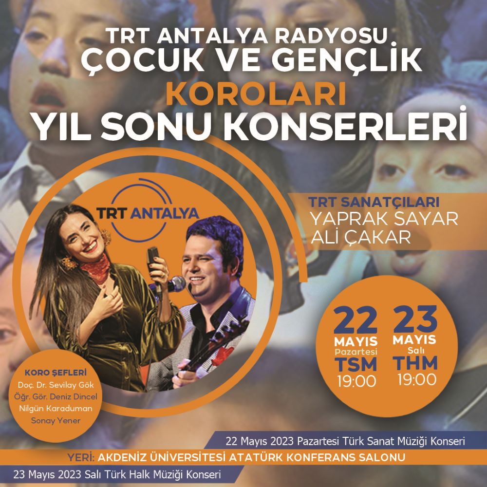 TRT Antalya Radyosu tarafından oluşturulan, bir yıl boyunca alanlarında uzman öğreticilerden eğitim alan Türk Halk Müziği ve Türk Sanat Müziği Çocuk ve Gençlik Koroları, ünlü TRT sanatçıları Yaprak Sayar ile Ali Çakar’ın da eşlik edeceği, iki gün sürecek konserler serisinde Antalyalı sanatseverlerle buluşacak.