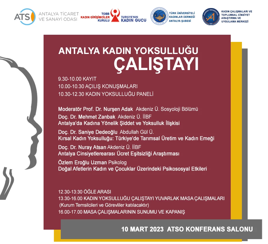 Cumhuriyetimizin 100. Yılında taze yaklaşımlarla çözümlememiz gereken en önemli sorunların başında kadın yoksulluğunun geldiğinin farkındalığıyla 10 Mart 2023 tarihinde ATSO Konferans Salonu’nda düzenlenecek “Antalya Kadın Yoksulluğu Çalıştayı”nda akademisyenler, sivil toplum örgütleri ve kamu kurumları temsilcileri yuvarlak masa çalışmalarında bir araya gelerek kadın yoksulluğuna karşı politika önerileri geliştireceklerdir. Ülkemiz kadınlarının yüzde yetmişinin istihdam dışında ve yoksulluğun pençesinde olduğu günümüzde bu manzaraya deprem koşullarının ağırlığının da eklenmesiyle çalıştay masalarında depremzede kadınların sorunlarının da ele alınması planlanmıştır. Bu çalıştayın sonuçlarının akademik camia ile birlikte ilgili sivil toplum kuruluşları ve kamu kurumlarında kadın yoksulluğuna yaklaşımlar açısından yeni ufuklar açacağını, taze çözümlere ilham vereceğini ve bu konuya odaklanan çabaların artacağını umut ediyoruz.
