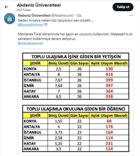 Antalya’daki toplu ulaşım ücretleriyle Konya, İstanbul, İzmir, Hatay ve Ankara gibi illerde uygulanan tarifeleri yayınlanan twitter hesabından @BocekMuhittin etiketlenerek, “Neden Antalya neden bizi üzüyorsun sen sürekli...” diye sitem dolu bir gönderme yapıldı. /GÜNHABER