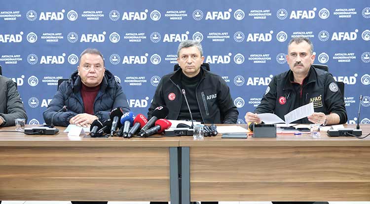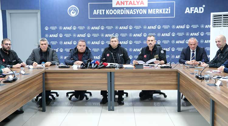 Antalya Valisi Hulusi Şahin, AFAD İl Müdürlüğü Afet Koordinasyon Merkezinde son durum hakkında bilgi toplantısı yapıldı. Toplantıya AFAD Başkan Yardımcısı Önder Bozkurt, Antalya Büyükşehir Belediye Başkanı Muhittin Böcek, Antalya İl Emniyet Müdürü Orhan Çevik, Gençlik Spor İl Müdürü Yavuz Gürhan, Antalya İl Sağlık Müdürü Evren Ekingen katıldı.