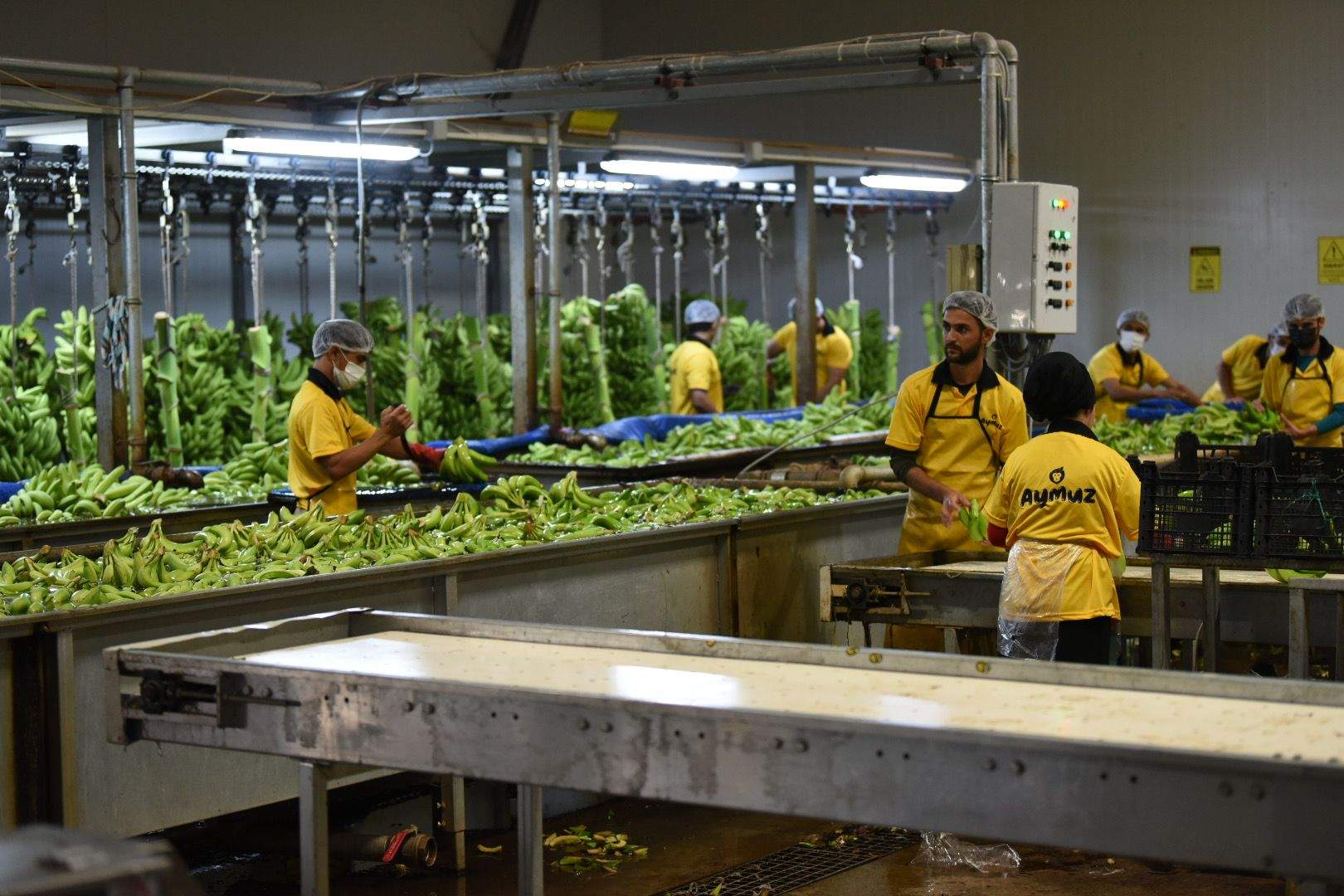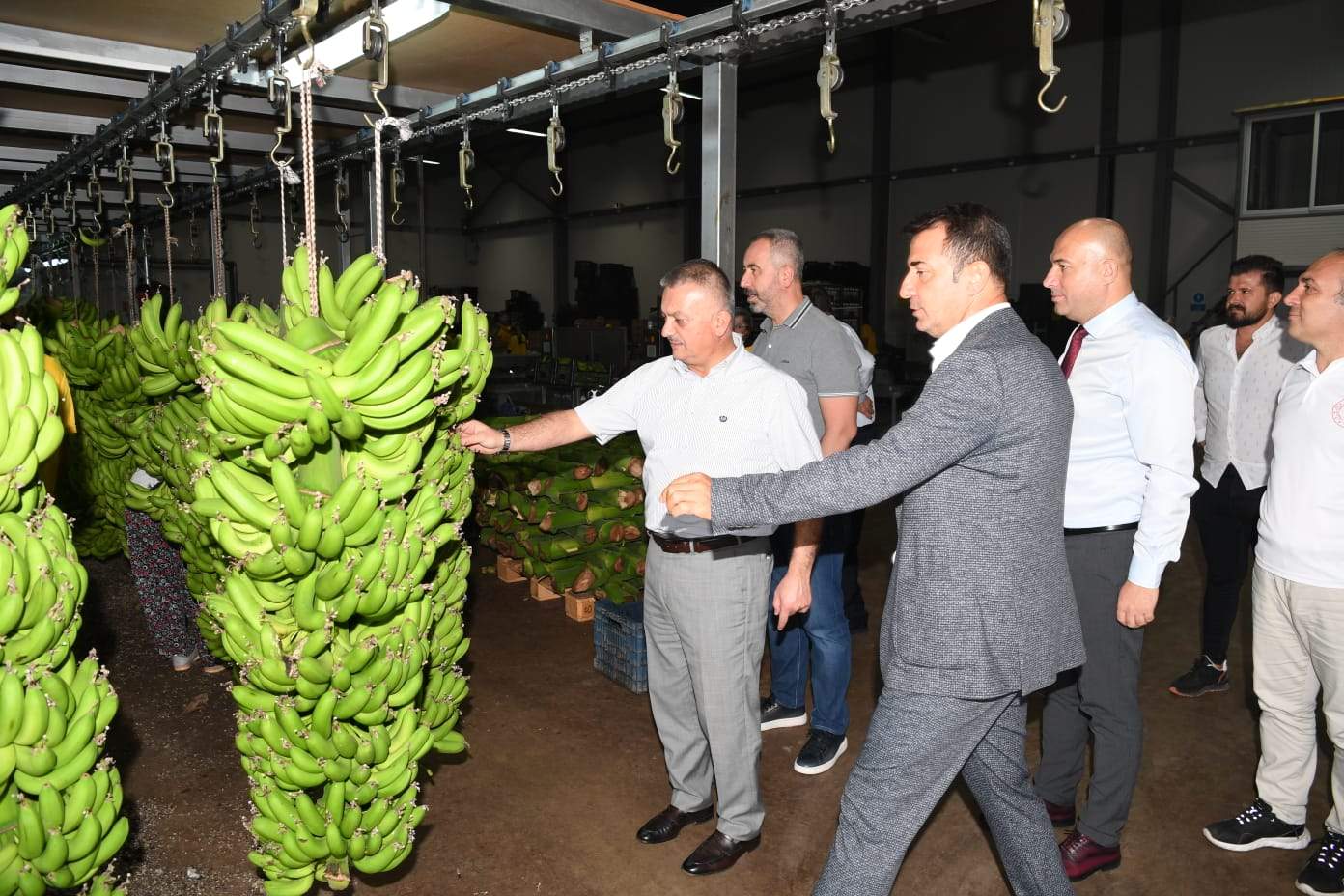 Yüksel Tohum firmasını ziyaretin ardından ikinci ziyaretini Türkiye’nin en büyük yerli muz üreticilerden biri olan Aymuz Tarım firmasına gerçekleştiren Vali Yazıcı ve Gelir İdaresi Başkanı Bekir Bayrakdar, Manavgat ilçesinde bulunan firmayı ziyaret ederek incelemelerde bulundu. İşletmesinin sarartma, paketleme bölümlerini incelen Vali Yazıcı ve beraberindeki heyet; muz üretimi, sarartma ve paketleme yöntemleri hakkında işletme sahibi Ayhan Taş’tan bilgiler aldı.