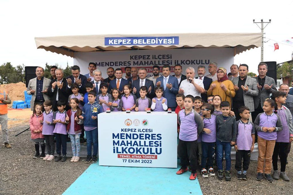 Kepez İlçesi Menderes mahallesinde tamamı devlet tarafından karşılanan 32 derslikli okulun temel atma törenine; Vali Ersin Yazıcı, Antalya Milletvekili Kemal Çelik, Kepez Kaymakamı Nusret Şahin, Kepez Belediye Başkanı Hakan Tütüncü, İl Milli Eğitim Müdürü Emre Çalışkan, Menderes Mahalle Muhtarı Mehmet Eren katıldı. Tören Yeni Mahalle İlkokulu Halk Oyunları Ekibi’nin gösterisiyle başladı.