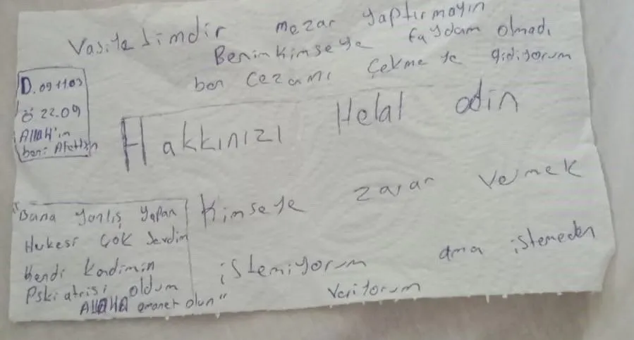 Antalya'nın Kumluca ilçesinde 22 Eylül'de WhatsApp'ta kurduğu grupta yer alanlarla vedalaşıp, bir peçeteye ‘Mezar taşımı yaptırmayın' notunu yazdıktan sonra ortadan kaybolan 22 yaşındaki genç ormanlık alanda ölü bulundu.