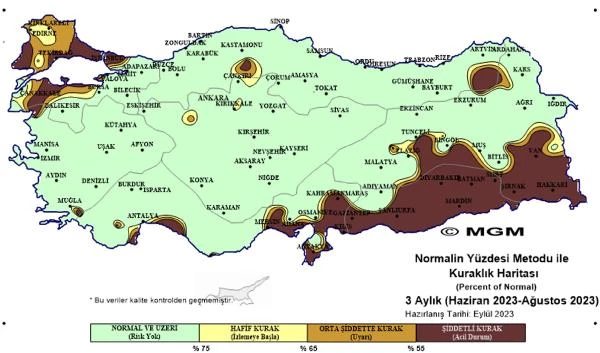 Meteoroloji'nin ağustos ayına yönelik Normalin Yüzdesi Metodu'na (PNI- Percent of Normal Index) göre hazırlanan meteorolojik kuraklık durumunu gösteren Türkiye haritasında ise Marmara Bölgesi, Karadeniz'in neredeyse tamamı, diğer bölgelerin de büyük kısmı için 'şiddetli kurak (acil durum)' olarak yer verildi. Haritaya göre, İzmir Aydın, Denizli, Muğla, Antalya ve Mersin'in bir kısmı normal ve üzeri (risk yok) olarak görülüyor. Erzincan-Tunceli ile Muş, Bitlis, Van, Siirt ve çevreleri de yine haritada meteorolojik kuraklık açısından normal ve üzeri (risk yok) alanlar olarak yer alıyor.