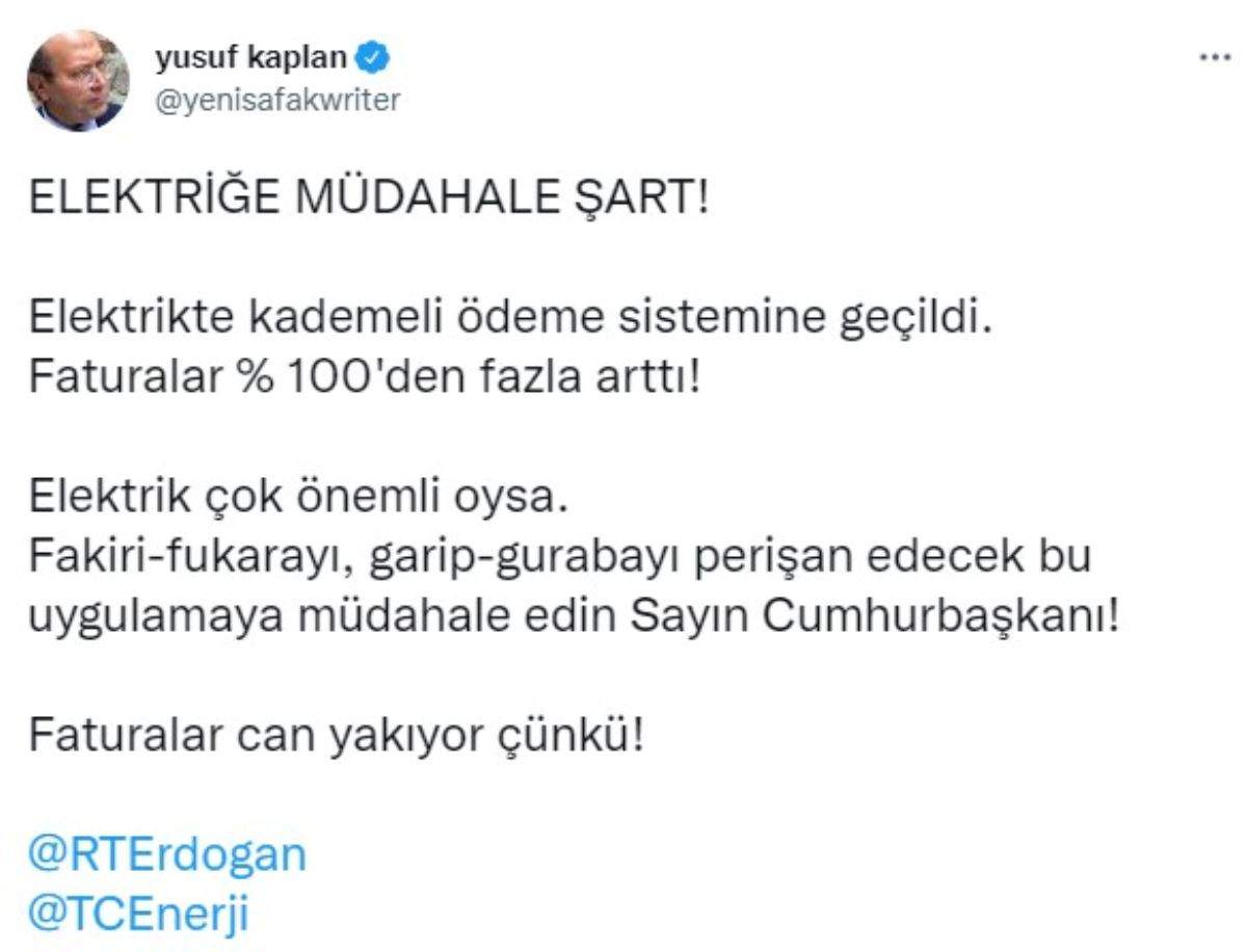 Twitter hesabından paylaşımda bulunan Kaplan, Cumhurbaşkanı Recep Tayyip Erdoğan'a seslendi. Elektirik faturalarındaki zamma tepki gösteren Kaplan, müdahalenin 'şart olduğunu' belirtti.