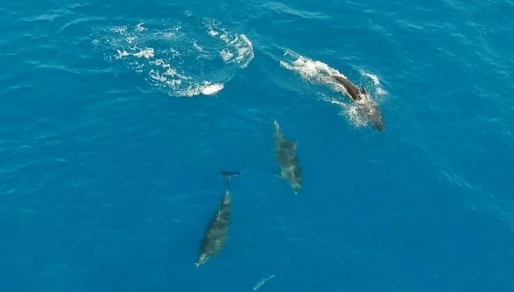 Antalya’nın Kemer ilçesi açıklarında yunusların palamut balığı avı, dron ile saniye saniye görüntülendi. Avlarını çembere alan yunuslar, uzun uğraşlar sonucu balığı yakaladı.