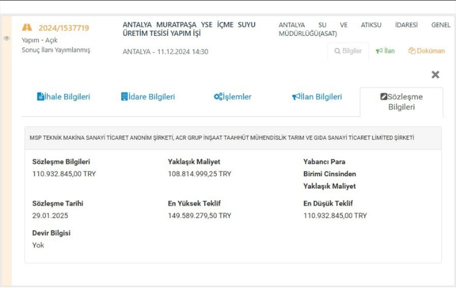 Lider Gazete’nin ulaştığı belgelere göre, skandalın perde arkasındaki çarpıcı gerçekler gün yüzüne çıktı. EKAP kayıtlarına göre, 2024/1537719 ihale kayıt numarasıyla yapılan “Antalya Muratpaşa YSE İçme Suyu Üretim Tesisi Yapım İşi” ihalesi, Bayındır Mahallesi’nde 2566 ada 1-2-3-4-29-30-31-32 parseller üzerinde bulunan mevcut içme suyu tesisine hazne ve yeni manevra odası ilavesini kapsıyor. 11 Aralık 2024 tarihinde gerçekleştirilen ihalenin yaklaşık maliyeti 108 milyon 814 bin 999 TL olarak belirlendi. İhale sonucunda sözleşme, 110 milyon 932 bin 845 TL bedelle 29 Ocak 2025 tarihinde imzalandı. En yüksek teklifin ise 149 milyon 589 bin TL seviyesinde olduğu kayıtlara yansıdı.
