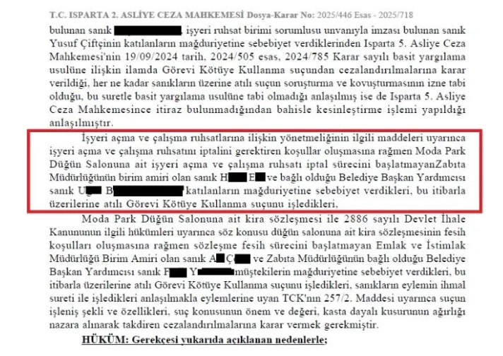 Davayı gören Isparta 2. Asliye Ceza Mahkemesi, aralarında Isparta Belediye Başkan Yardımcıları U.B. ve F.Y., Zabıta Amiri H.E., Emlak İstimlak Müdürlüğü Birim Amiri A.Ç.’nin olduğu belediye bürokratlarının “ihmal suretiyle görevi kötüye kullanma” suçu işlediklerini belirterek 3’er ay hapis cezası verdi. Mahkemenin, 23 Ekim 2025 tarihli gerekçeli kararında, “Moda Park Düğün Salonuna ait kira sözleşmesi ile 2886 sayılı Devlet İhale Kanununun ilgili hükümleri uyarınca söz konusu düğün salonuna ait kira sözleşmesinin fesih koşulları oluşmasına rağmen sözleşme fesih sürecini başlatmayan Emlak ve İstimlak Müdürlüğü Birim Amiri olan sanık A. Ç ve Zabıta Müdürlüğünün bağlı olduğu Belediye Başkan Yardımcısı sanık F.Y.’nin müştekilerin mağduriyetine sebebiyet verdikleri, bu itibarla üzerlerine atılı Görevi Kötüye Kullanma suçunu işledikleri, sanıkların eylemin ihmal sureti ile işledikleri anlaşılmakla eylemlerine uyan TCK'nın 257/2. Maddesi uyarınca suçun işleniş şekli ve özellikleri, suç konusunun önem ve değeri, kasta dayalı kusurunun ağırlığı nazara alınarak takdiren cezalandırılmalarına karar vermek gerekmiştir” denildi.