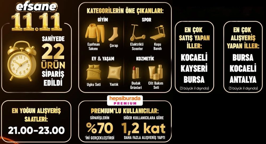 Hepsiburada, bu yıl da 11.11 kampanyasında büyük ilgi gördü. 11 Kasım günü platformun ziyaret sayısı geçen yıla göre yüzde 10 artarken, saniyede 22 ürün satıldı. En yoğun alışveriş 21.00-23.00 saatleri arasında gerçekleşti. Moda, teknoloji, ev-yaşam, kişisel bakım ve süpermarket kategorileri kampanya döneminin en çok tercih edilenleri oldu.
