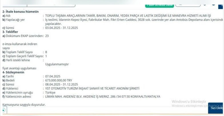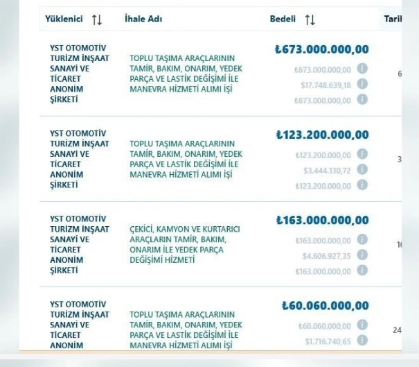 Lider Gazete’nin haberine göre, YST Otomotiv Turizm İnşaat Sanayi AŞ’ye 4 Şubat 2025’te 123 milyon liralık bakım-onarım sözleşmesi verildi. Sektör temsilcilerinden edinilen veriler, yalnızca son bir yılda firmaya yapılan toplam ödemenin 580 milyon liraya ulaştığını ortaya çıkardı. Aynı dönemde şehir içi ulaşım hizmetini fiilen sürdüren esnafa yapılan ödemenin ise yaklaşık 600 milyon lira olduğu belirtildi. Şoför maaşları, yakıt, sigorta, lastik ve günlük işletme giderleri ulaşım esnafı tarafından karşılanırken, bakım kalemindeki harcamanın büyüklüğü dikkat çekti. İhalenin bitiş tarihinin önceden biliniyor olmasına rağmen geçiş planı yapılmaması ve yüzlerce aracın aynı anda servise alınması, “planlama eksikliği” ve “kriz yönetimi zafiyeti” eleştirilerini beraberinde getirdi.