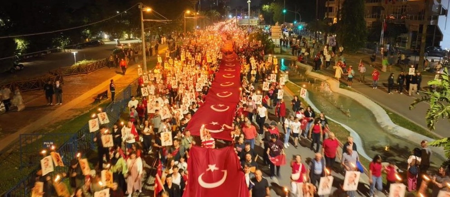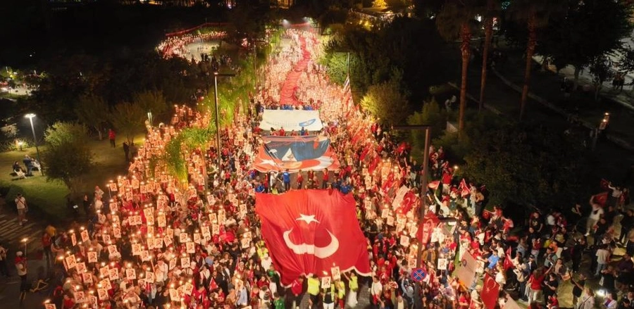 Konyaaltı Varyant'ta toplanan kalabalık yürüyüş güzergahını doldurdu. Antalya Valisi Hulusi Şahin, Büyükşehir Belediye Başkan Vekili Büşra Dirgen Özdemir, sivil toplum kuruluşlarının temsilcileri ve yüzlerce vatandaşın katıldığı yürüyüşte 400 metrelik dev Türk bayrağı taşındı.