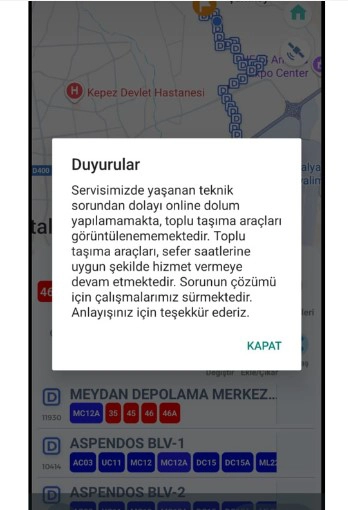 "Servisimizde yaşanan teknik sorundan dolayı online dolum yapılamamakta, toplu taşıma araçları görüntülenememektedir. Toplu taşıma araçları, sefer saatlerine uygun şekilde hizmet vermeye devam etmektedir. Sorunun çözümü için çalışmalarımız sürmektedir. Anlayışınız için teşekkür ederiz."