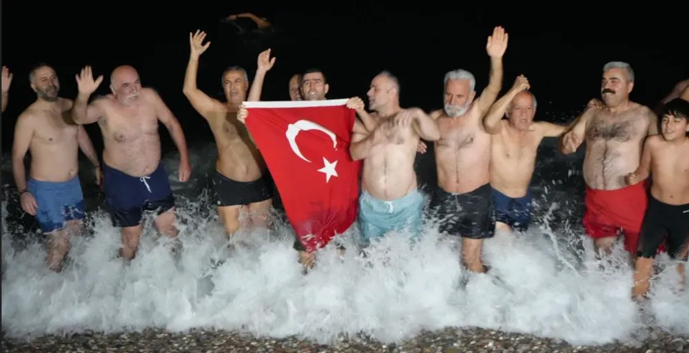 Gece saatlerinde Konyaaltı Sahili’nde bir araya gelen yaklaşık 30 kişilik grup, ellerinde Türk bayraklarıyla geri sayım yaparak yeni yılı denizde karşıladı. Saatler 00.00’ı gösterdiğinde ise grup üyeleri hep birlikte denize girerek 2026 yılının ilk dakikalarını Akdeniz’in serin sularında geçirdi.