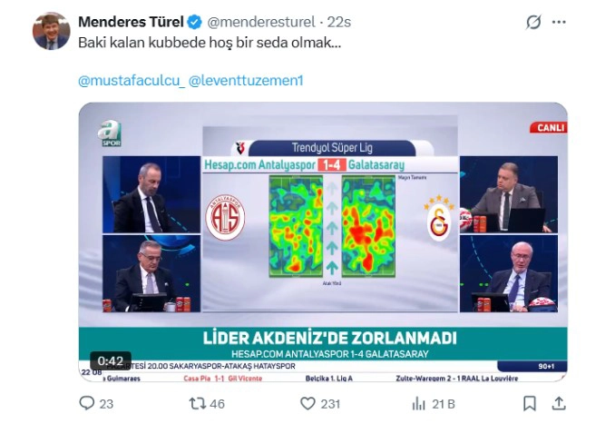 Tüzemen’in açıklamaları, Menderes Türel tarafından sosyal medya hesabından “Baki kalan kubbede hoş bir seda olmak…” notuyla paylaşıldı. Paylaşım kısa sürede geniş etkileşim alırken, Antalyaspor taraftarlarının yanı sıra çok sayıda vatandaş görüşlerini yorumlarla ifade etti.