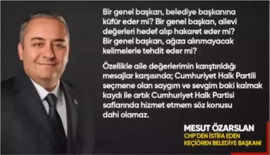Ankara Keçiören Belediye Başkanı Mesut Özarslan CHP'den istifa etti, küfür tartışması başladı. CHP Genel Başkanı Özgür Özel'den "tehdit ve hakaret" içeren mesajlar aldığını ileri süren Özarslan, suç duyurusunda bulunacağını söyledi. Özel'den ise gündemi sarsan iddialarla ilgili açıklama geldi.