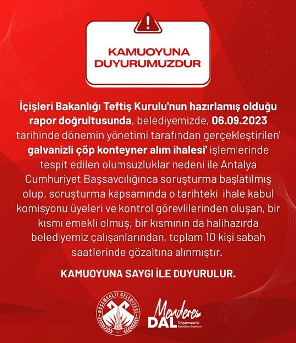 Döşemealtı Belediyesi yaptığı açıklamada, “İçişleri Bakanlığı Teftiş Kurulu'nun hazırlamış olduğu rapor doğrultusunda, belediyemizde, 06.09.2023 tarihinde dönemin yönetimi tarafından gerçekleştirilen' galvanizli çöp konteyner alım ihalesi' işlemlerinde tespit edilen olumsuzluklar nedeni ile Antalya Cumhuriyet Başsavcılığınca soruşturma başlatılmış olup, soruşturma kapsamında o tarihteki ihale kabul komisyonu üyeleri ve kontrol görevlilerinden oluşan, bir kısmı emekli olmuş, bir kısmının da halihazırda belediyemiz çalışanlarından, toplam 10 kişi sabah saatlerinde gözaltına alınmıştır “ ifadelerini kullandı.