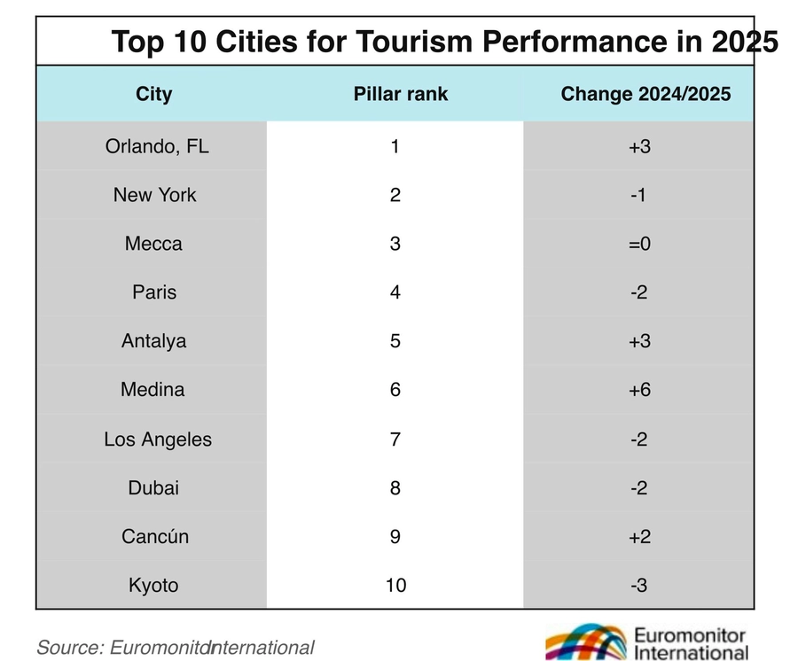 Uluslararası araştırma şirketi Euromonitor'un 2025 yılı için hazırladığı 'Dünyanın En İyi 10 Turizm Destinasyonu' listesinde 5’inci sırada yer alan Antalya, bu listeye girebilen Türkiye'deki ilk ve tek şehir oldu.