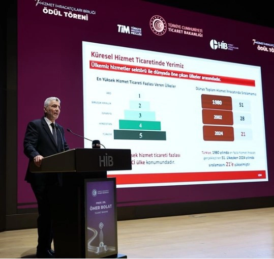 Türkiye'nin geçen yıl en çok hizmet ihracatı yapan şirketlerinin ödüllendirildiği 7. Hizmet İhracatçıları Birliği (HİB) Ödül Töreni, Ticaret Bakanı Ömer Bolat'ın katılımıyla TİM Dış Ticaret Kompleksi'nde düzenlendi.