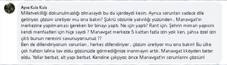 Açıklamasında ilçenin mevcut durumuna da dikkat çeken Kula, altyapı ve ulaşım sorunlarının görmezden gelindiğini dile getirdi. Ayşe Kula, “Manavgat köyden beter oldu. Yollar berbat, altyapı berbat. Kendine çalışıyor. Önce Manavgat’ın sorunlarını çözün” diyerek, yıllardır çözülmeyen altyapı problemleri dururken, rant odaklı projelerin öncelik haline getirilmesini sert şekilde eleştirdi.